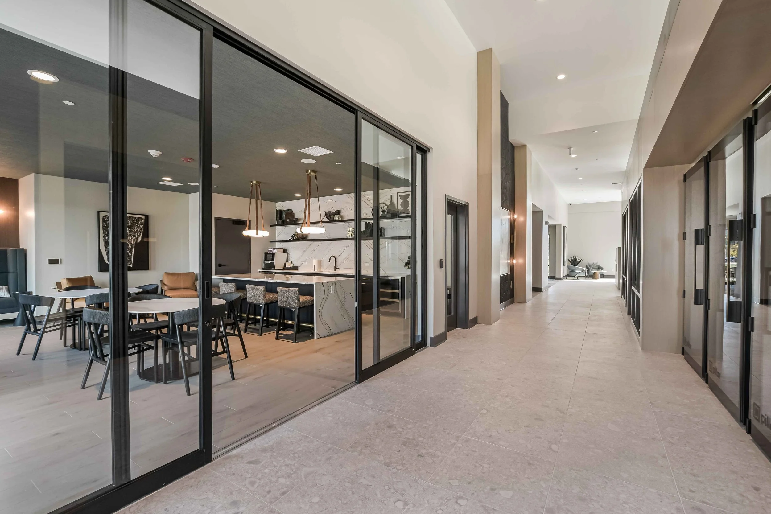 In the lobby, a dual-sided fireplace, vertical wood slats, and refined custom millwork create a strong sense of arrival with a hospitality influence that elevates the leasing experience. Beyond the lobby, the design unfolds into game, fitness, coworking, and lounge areas that flow naturally to the courtyard and pool. The palette of warm taupes, charcoal upholstery, pale stone flooring, and brushed brass accents carries through each space, creating visual softness and cohesion.Every detail responds to the expectations of today’s renter, resulting in a timeless warm-modern interior that feels grounded and inviting.
